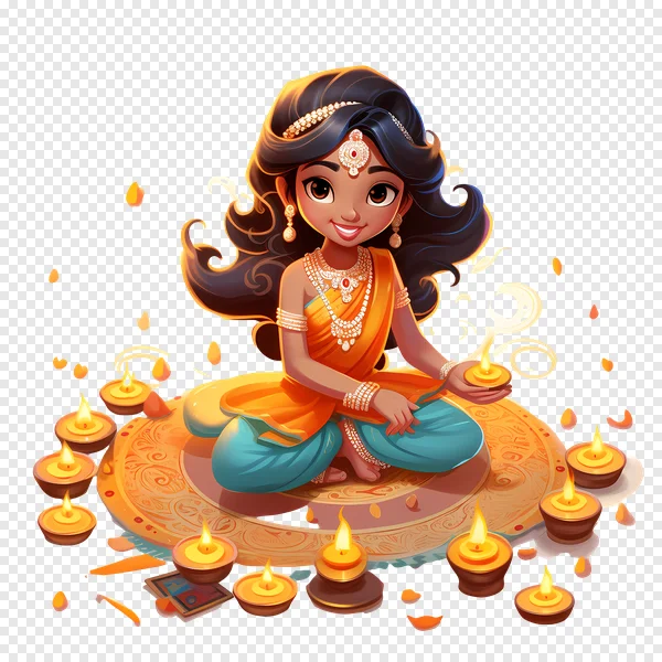 Tags: Diwali Diya Hindu festival Indian girl Lakshmi Puja PNG bindi celebration cultural cute girl decorative rug ethnic festive illustration jewelry lamps oil lamp smiling child traditional vibrant