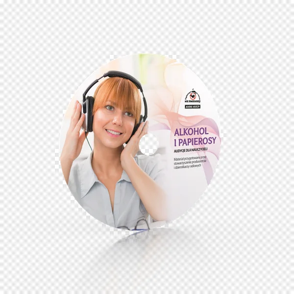 Download this high-quality PNG image featuring a CD with a smiling woman wearing headphones, ideal for conveying themes of listening, learning, and educational content. The disc clearly labels its purpose as 'ALKOHOL I PAPIEROSY AUDYCJE DLA NAUCZYCIELI' (Alcohol and Cigarettes Programs for Teachers), making it a perfect visual for health education initiatives, anti-addiction campaigns, and teaching resources. This free graphic is excellent for websites, e-learning platforms, presentations, or any project aiming to promote public health awareness and provide educational material for educators. Enhance your digital content with this impactful and relevant visual today!