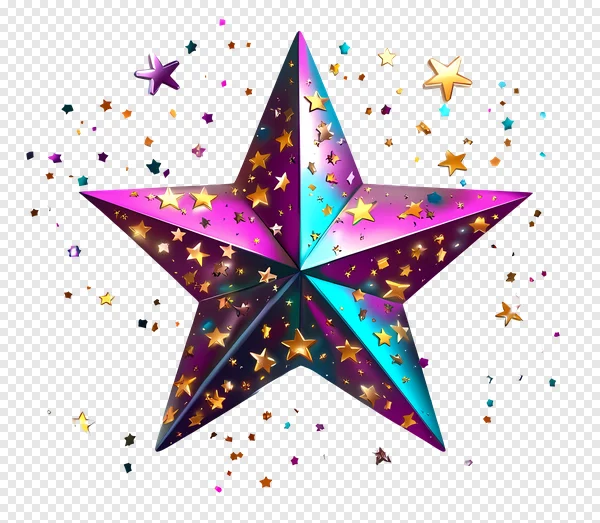 Discover this mesmerizing, high-quality PNG featuring a large, five-pointed star with a stunning pink and blue gradient, shimmering against a pure black background. Adorned with countless smaller golden stars and surrounded by a vibrant burst of colorful confetti, this graphic instantly adds a festive, magical, and celebratory touch to any project. Perfect for party invitations, birthday cards, achievement awards, holiday designs, social media posts, or any digital art requiring a dazzling focal point. Download this free transparent star PNG to effortlessly enhance your creative endeavors with its brilliant sparkle and dynamic flair. Ideal for designers, event planners, and content creators looking for a striking decorative element.