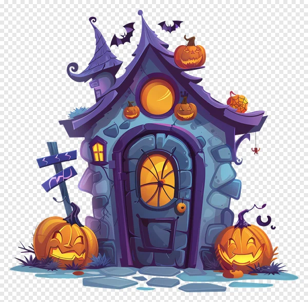 Download this enchanting cartoon Halloween haunted house PNG for free! This high-quality, transparent illustration features a whimsical purple and blue spooky house adorned with glowing jack-o'-lanterns, a mysterious spiderweb, and a flock of flying bats under a pointed roof. Perfect for adding a festive and creepy-cute touch to your Halloween party invitations, social media graphics, scrapbooking, craft projects, or website decor. Get this unique digital art asset for instant download and bring your designs to life!