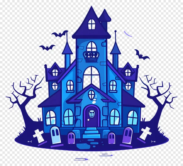 Immerse your projects in eerie charm with this free transparent PNG of a spooky cartoon haunted house. Dominated by mysterious dark blue and purple tones, this Halloween mansion features broken windows, flying bats, gnarled bare trees, and ominous gravestones, all set against a dark night. Ideal for digital art, party invitations, website banners, social media posts, or creating a chilling atmosphere for your Halloween-themed designs. Instantly download this high-quality illustration and add a touch of gothic whimsy to your creative endeavors. Perfect for designers, crafters, and Halloween enthusiasts looking for a fun yet spooky graphic.