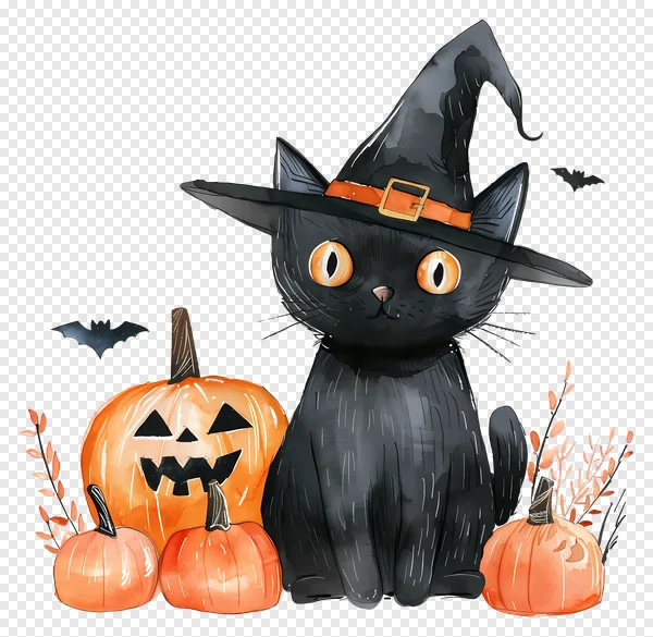 Get into the Halloween spirit with this adorable free PNG image! Featuring a charming black cat wearing a classic witch hat with an orange buckle, accompanied by a spooky carved jack-o'-lantern, cute mini pumpkins, and flying bats. The watercolor illustration style gives it a whimsical and slightly eerie feel, perfect for all your spooky season designs. Download this high-quality transparent PNG for free to use in party invitations, social media graphics, greeting cards, DIY crafts, or any creative Halloween project. Ideal for adding a touch of cute fright to your designs. Enhance your autumn and Halloween themes instantly with this captivating illustration. Free for personal and commercial use (check license for specifics).