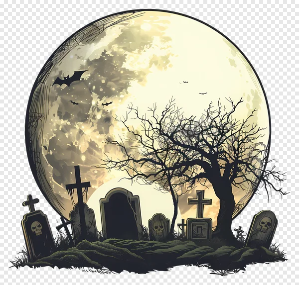 Download this free, high-quality PNG image of a spooky Halloween cemetery scene! Featuring a large, glowing full moon, silhouetted tombstones, a gnarled tree, and bats flying across the night sky, it's perfect for Halloween designs, spooky graphics, website backgrounds, and more. Enhance your projects with this eerie and atmospheric illustration – download now and add a touch of Halloween magic!