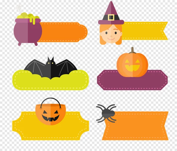 Unleash your creativity this Halloween with our free PNG set of 6 flat design banners and labels! Featuring spooky-cute icons like a witch's cauldron bubbling with potion, a friendly witch head, a flying bat, a carved jack-o'-lantern, a trick-or-treat candy bucket, and a creepy spider, these transparent background vectors are perfect for adding your own text. Use them for invitations, party flyers, social media graphics, website promotions, or any festive project. Easy to customize and ready for instant download, get these high-quality Halloween elements to make your designs pop!