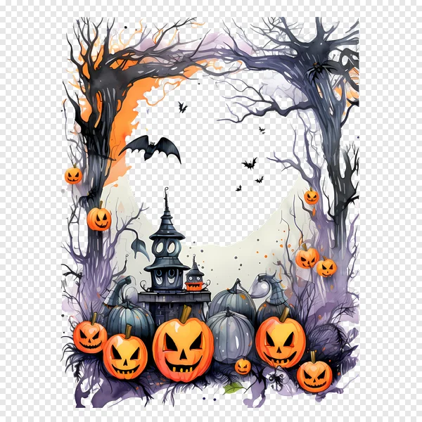 Dive into the eerie charm of Halloween with this captivating free PNG image! It features a spooky haunted forest with twisted bare trees, a flying bat, and an abundance of grinning jack-o'-lanterns, all framing a central moonlit space. A mysterious haunted house peeks from the bottom, enhancing the creepy ambiance. Perfect for designing unique Halloween invitations, social media posts, party banners, or desktop wallpapers. This high-quality, transparent background image offers endless creative possibilities. Download this festive, creepy-cute border now to bewitch your audience!