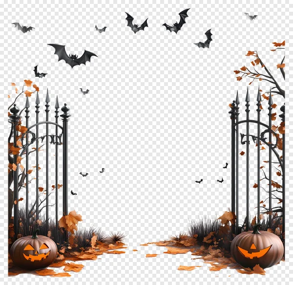 Step into the spooky spirit of Halloween with this enchanting free PNG image! Featuring a pair of eerie, ornate iron gates framing an open space, surrounded by scattered autumn leaves and dark foliage. Two glowing jack-o'-lanterns with classic carved faces sit sentinel at the base, while a flock of menacing bats takes flight against the dark sky. Perfect for creating captivating Halloween invitations, party decorations, social media posts, or adding a touch of spooky charm to any graphic design project. Download this high-quality, transparent background PNG instantly and bring your Halloween visions to life!