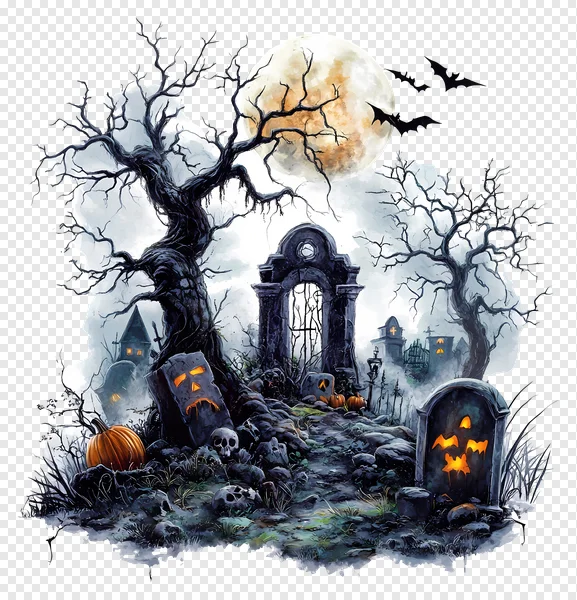 Step into a chilling Halloween night with this free PNG download featuring a haunted graveyard under a luminous full moon. This eerie scene includes glowing jack-o'-lanterns, ancient gnarled trees, ominous tombstones, and distant haunted houses shrouded in mist. Bats fly across the moonlight, adding to the spooky atmosphere. Perfect for your Halloween projects, decorations, invitations, or digital designs. Download this high-quality, transparent background image now to create truly haunting visuals for the festive season!