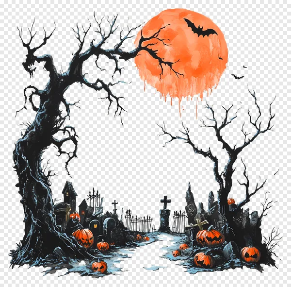 Download this captivating free PNG image for a truly eerie Halloween experience! Featuring a dark, spooky graveyard scene framed by gnarled, bare trees and illuminated by a menacing, dripping blood-orange full moon, with silhouetted bats flying ominously. Numerous carved jack-o'-lanterns with glowing, scary faces are scattered among ancient gravestones and crosses, and spooky houses in the background. Perfect for Halloween party invitations, social media posts, website banners, craft projects, or adding a chilling touch to any design. Get this high-quality transparent background graphic now and unleash the spooky spirit!