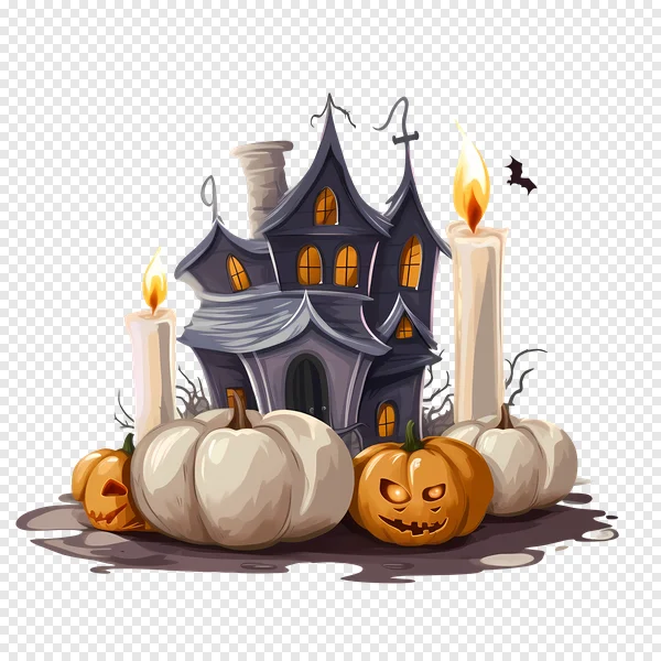 Download this captivating spooky Halloween PNG featuring a charming haunted house with glowing windows, surrounded by classic white pumpkins, a scary jack-o'-lantern, and two flickering candles. Perfect for adding a festive and eerie touch to your designs, social media posts, invitations, or craft projects. This high-quality, free transparent image is ideal for seasonal greetings, event promotions, or simply enhancing your Halloween-themed content. Get your free download now and make your designs pop with a touch of seasonal magic!