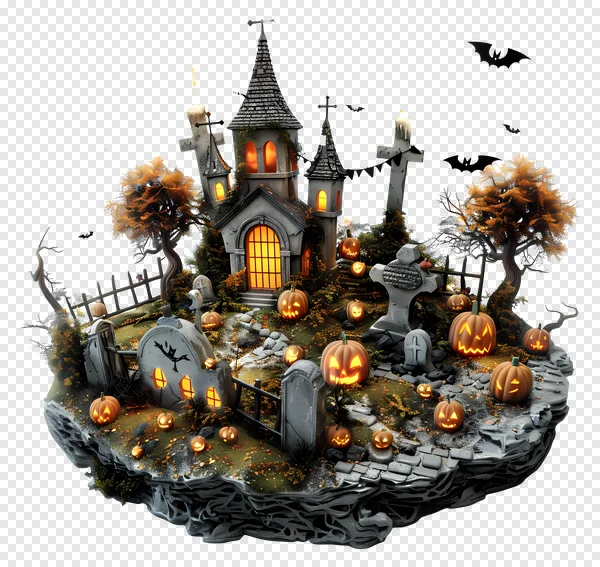 Dive into the spirit of Halloween with this stunning, free transparent PNG of a spooky haunted floating island. This intricate digital art piece features a gothic chapel with warm, glowing windows, surrounded by a chilling graveyard with various tombstones, ancient crosses, and flickering candles. Numerous intricately carved jack-o'-lanterns illuminate the paths, while eerie autumn trees and flying bats complete the ghostly night scene. Perfect for seasonal designs, invitations, website banners, or adding a magical touch to your creative projects. Download this high-quality illustration today!