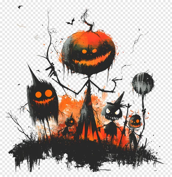 Get into the Halloween spirit with this chilling, free PNG image featuring a colossal jack-o'-lantern with a sinister grin and glowing eyes. This dark and artistic illustration showcases an assembly of spooky creatures, including a spectral ghost and eerie scarecrow figures, all set against a backdrop of fiery orange hues and grunge textures. Bats flutter in the ominous sky, adding to the haunted atmosphere. Ideal for graphic designers, educators, or anyone looking to enhance their Halloween-themed content. Download this high-quality, transparent PNG now for your invitations, decorations, social media, or creative projects. Instantly add a touch of artistic horror to your designs!
