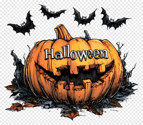 Get into the Halloween spirit with this vibrant, free PNG image featuring a classic jack-o'-lantern pumpkin illuminated by the word "Halloween" across its face. A flock of shadowy bats flies above, while eerie tendrils and autumn leaves surround the spooky carved pumpkin, all set against a dark, mysterious background. Perfect for creating eye-catching party invitations, seasonal social media posts, website banners, or unique holiday decorations. Download this high-quality, transparent background illustration instantly and add a touch of festive fright to your projects without any cost! Ideal for graphic designers, event planners, or anyone celebrating the autumn season.