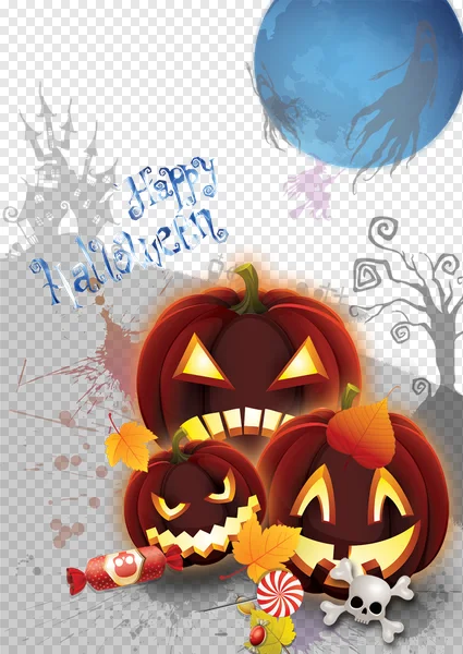 Get into the Halloween spirit with this vibrant, free PNG download featuring three spooky jack-o'-lanterns glowing eerily in the dark! This festive vector illustration includes a mysterious blue moon with ghostly figures, an artistic 'Halloween' text with blue flame accents, scattered autumn leaves, fun trick-or-treat candy (lollipop & wrapped treat), and a classic skull & crossbones. Perfect for party invitations, social media posts, website banners, or spooky decorations. Download this high-quality, transparent background graphic instantly to add a frightfully delightful touch to all your October projects. Ideal for designers, event planners, and Halloween enthusiasts looking for unique, free holiday assets.