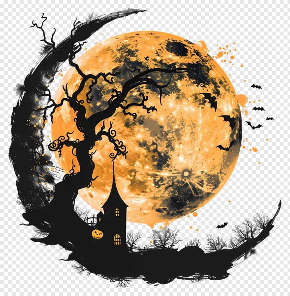 Download this stunning, high-quality Halloween moon PNG image for free! Featuring a silhouetted haunted house, eerie bare tree, and a vibrant orange full moon with splatters, it's perfect for your Halloween projects, spooky designs, social media graphics, or website backgrounds. Enhance your Halloween aesthetic with this free-to-use, transparent background image. Get creative and download now!
