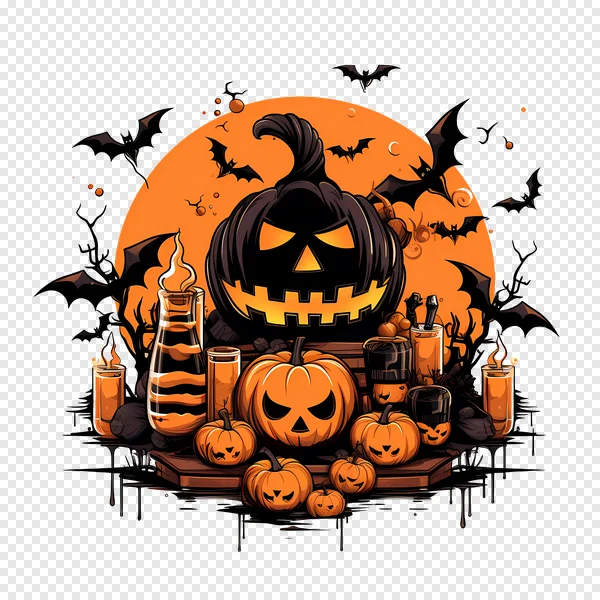 Immerse your projects in Halloween magic with this stunning free PNG image. Featuring a massive, menacing black jack-o'-lantern glowing brightly, surrounded by a multitude of smaller, intricately carved orange pumpkins. A vibrant orange full moon dominates the dark sky, casting an eerie glow as countless bats take flight. This high-quality illustration also includes mysterious vials and flickering candles, setting a perfectly spooky ambiance. Ideal for invitations, social media posts, website banners, decorations, and any creative endeavor needing a touch of frightful fun. Download this versatile Halloween scene today and bring your spooky visions to life, completely free!
