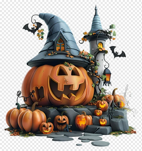 Unleash the spirit of Halloween with this enchanting, free PNG image! It showcases a whimsical yet spooky pumpkin house, crowned with a witch's hat roof and an adjacent haunted tower. The scene is illuminated by numerous glowing jack-o'-lanterns, while creepy bats flutter, and intricate vines with delicate spiderwebs adorn the structure. Perfect for adding a touch of festive fright to your digital scrapbooking, party invitations, website designs, social media graphics, or any creative project. Download this high-quality, transparent Halloween graphic for free and make your designs magically spooky!