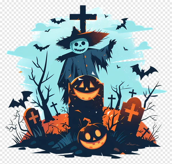 Download this free Halloween PNG featuring a spooky scarecrow standing in a graveyard with jack-o'-lanterns and bats! Perfect for Halloween designs, spooky graphics, party invitations, social media posts, and more. High-quality, transparent background for easy integration into your projects. Get your free download now and add a touch of frightful fun to your creations!