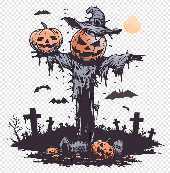 Download this chillingly charming Halloween scarecrow PNG for free! Perfect for adding a spooky touch to your designs, this transparent background image features a frightful scarecrow with two glowing jack-o'-lantern heads and a witch hat, standing amidst an eerie graveyard. Flying bats, a pale full moon, and scattered pumpkins complete the spooky scene. Ideal for Halloween invitations, party flyers, website banners, social media posts, or printables. Get this high-quality, festive illustration and bring your holiday projects to life with a touch of creepy fun!