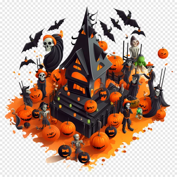 Download this free Halloween PNG featuring a detailed isometric illustration of a haunted house surrounded by pumpkins, skeletons, bats, and spooky details! Perfect for Halloween graphics, party invitations, website designs, social media posts, and more. High-resolution and transparent background for easy integration into your projects. Get your free download now and add a touch of frightful fun to your creations!