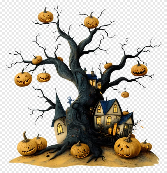 Download this enchanting Halloween PNG image featuring a whimsical tree house built into a gnarled tree, adorned with glowing Jack-o'-Lanterns! Perfect for Halloween graphics, spooky designs, party invitations, website backgrounds, and more. This high-quality, transparent background PNG is free to use for both personal and commercial projects. Add a touch of magical Halloween spirit to your creations – download now!