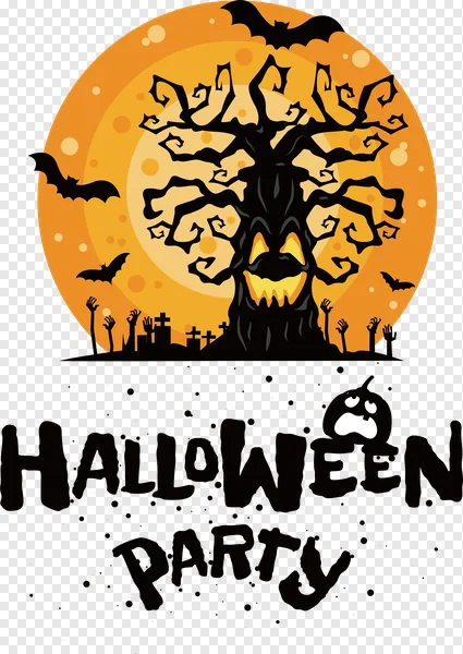 Get into the Halloween spirit with this fantastic free PNG! Featuring a creepy tree with a jack-o'-lantern face, a full moon, bats, spooky hands rising from graves, and a festive "Halloween Party" text design. Perfect for invitations, posters, social media graphics, and all your Halloween projects. Download now and add a touch of frightful fun to your designs! High-quality, transparent background for easy integration.