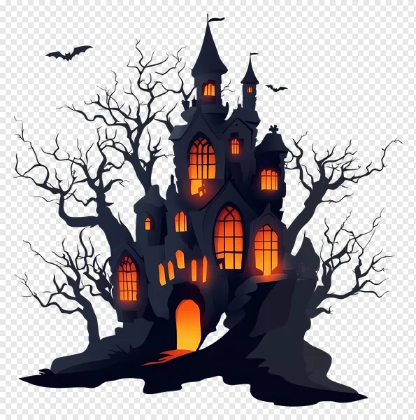 Download this stunning, high-quality haunted castle PNG image for free! Perfect for Halloween designs, spooky graphics, horror themes, and more. Use it for your websites, social media, presentations, or any creative project. This transparent background image features a detailed castle silhouette with glowing windows, eerie trees, and bats, creating a truly chilling atmosphere. Get your free download now and bring your Halloween visions to life!