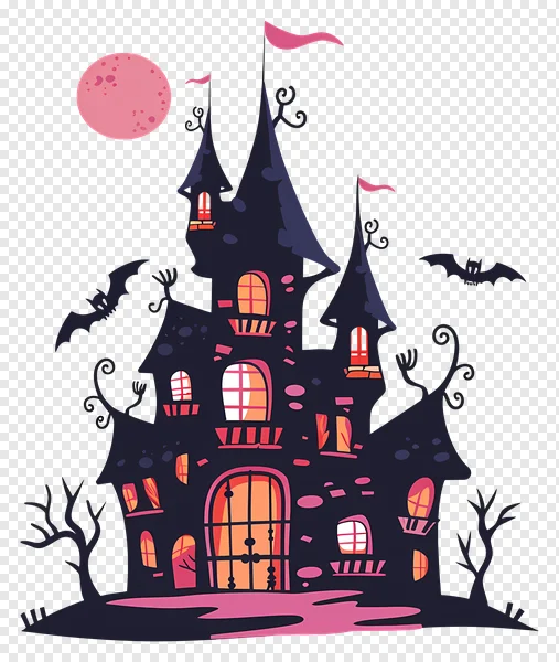 Step into the enchanting yet eerie world of Halloween with our free Haunted Castle PNG! This captivating cartoon illustration features a classic spooky mansion under a mystical pink full moon, with shadowy bats soaring across the dark night sky. Glowing windows cast warm, inviting (or perhaps unsettling) light, and gnarled trees frame the scene. Perfect for your Halloween invitations, party decorations, trick-or-treat banners, website graphics, or any spooky creative project. Download this high-quality, transparent PNG for instant fright-night charm. Get ready to add a touch of whimsical horror to your designs – completely free!