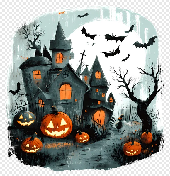 Step into the eerie night with our captivating Halloween Haunted House illustration! This free PNG features a towering, shadowy mansion with glowing orange windows, surrounded by a multitude of grinning Jack-o'-lanterns casting a warm, spooky glow. Silhouettes of bats soar against a misty, moonlit sky, alongside twisted, bare trees and a lonely figure. Perfect for adding a touch of festive fright to your Halloween invitations, social media posts, website banners, party decorations, or digital projects. Download this high-quality, transparent PNG now to create uniquely chilling and charming designs that capture the spirit of the season! Get this vibrant, hand-drawn style artwork instantly for your creative needs.