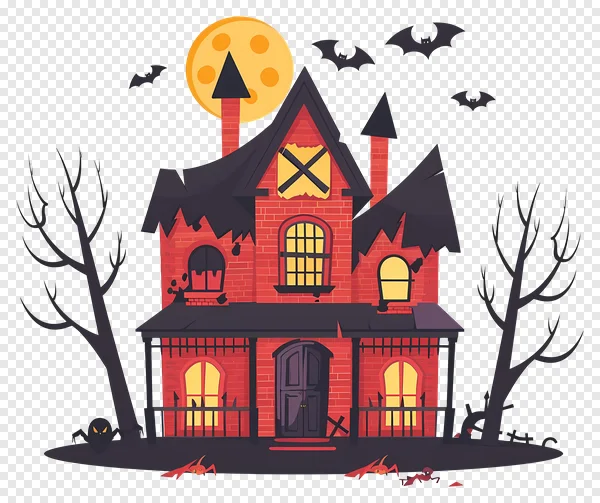 Immerse yourself in the eerie charm of Halloween with this free, high-quality PNG featuring a classic spooky haunted house. This vibrant illustration showcases a dilapidated red brick mansion with a tattered roof and glowing windows, silhouetted against a brilliant full moon. Bare, gnarled trees flank the house, while a swarm of bats takes flight in the night sky. Creepy creatures lurk on the shadowy ground, adding to the frightful atmosphere. Perfect for Halloween projects, party invitations, digital art, presentations, or website decorations. Download this transparent background vector-style image instantly and bring a touch of ghostly fun to your designs!