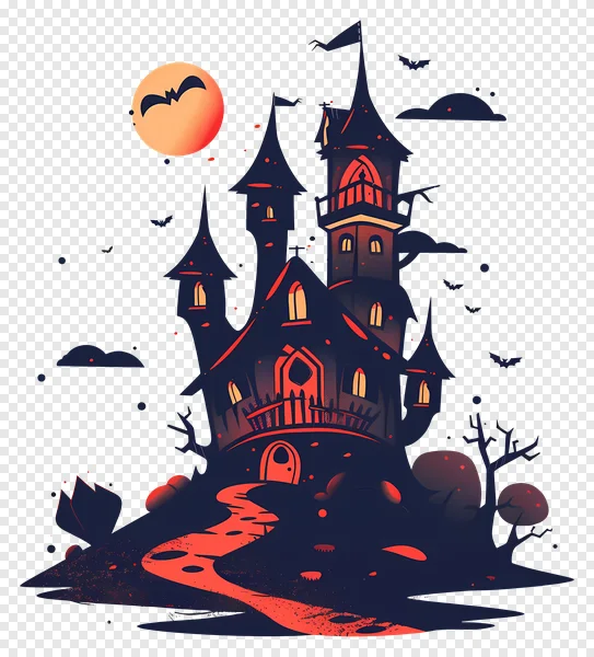 Step into the shadows with this captivating free PNG of a spooky haunted house illustration. Featuring a towering mansion under a vibrant orange full moon with silhouetted bats, a glowing path, and eerie bare trees, this image sets the perfect Halloween scene. Ideal for your holiday designs, digital projects, invitations, or adding a touch of spooky charm to any creative work. Download this high-quality, transparent PNG to instantly elevate your trick-or-treat themed content or create a chilling atmosphere for your audience. Perfect for graphic designers, content creators, and Halloween enthusiasts looking for unique, royalty-free art.