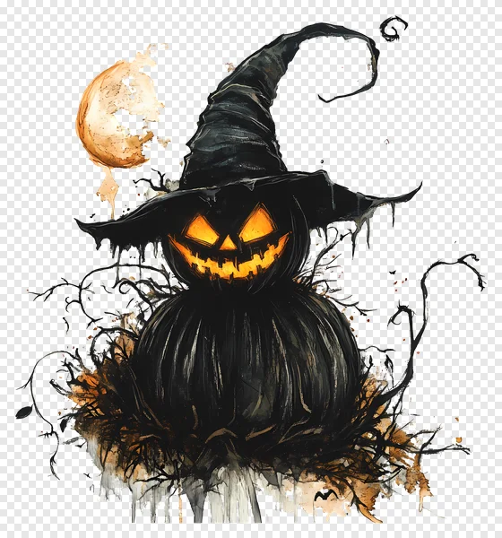 Download this chillingly beautiful Jack-o'-Lantern PNG image for free! Perfect for Halloween designs, spooky graphics, party invitations, or adding a touch of frightful fun to your projects. This high-quality, transparent background PNG features a detailed pumpkin face with a witch's hat, glowing eyes, and a creepy, textured effect. Enhance your Halloween creations with this free-to-use resource. Get your download now!