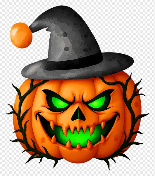 Get ready for Halloween with this terrifyingly cool Jack-o'-Lantern PNG! Featuring a vibrant orange pumpkin wearing a classic grey witch hat topped with an orange pom-pom, glowing green eyes, and a wicked, toothy grin surrounded by dark, twisted vines. This eye-catching illustration perfectly captures the spooky spirit of the season. Ideal for haunted party invitations, digital crafts, seasonal decorations, social media posts, or adding a festive touch to any project. Download this high-quality, free transparent PNG image today to create chilling designs for your haunted season projects!