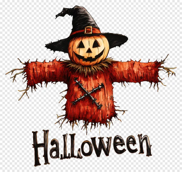 Get ready for fright night with our captivating free Halloween scarecrow PNG! This high-quality graphic features a friendly yet spooky jack-o'-lantern head adorned with a classic black witch's hat, perched atop a rustic, tattered orange scarecrow body with straw details. The vibrant orange and deep black colors, combined with the stylized 'Halloween' text below, make it perfect for all your seasonal designs. With its transparent background, you can easily integrate this festive and eerie illustration into invitations, social media posts, digital art projects, or printable decorations. Download this unique graphic today and add a touch of charming Halloween spirit to your creations without any cost!