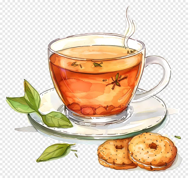 Download this charming, high-quality PNG illustration featuring a steaming hot cup of spiced tea, infused with fragrant star anise and delicate green mint leaves. Accompanying this cozy beverage are two delicious cream-filled cookies, rendered in a beautiful watercolor style. Perfect for cafes, food blogs, menu designs, digital art, or personal projects. Get this free transparent background image today to add warmth and a touch of elegance to your designs. Enhance your creative works with this delightful, ready-to-use graphic!