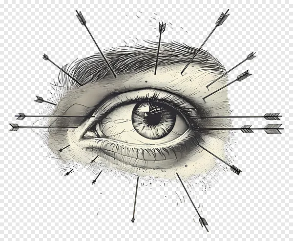 Discover our unique free PNG of a striking eye pierced by multiple arrows, rendered in a captivating black and white digital art style. This high-resolution image offers a surreal and conceptual element for your graphic design projects, presentations, or artistic compositions. Perfect for themes of pain, resilience, focus, or an abstract human condition. Download this detailed, high-quality transparent PNG today to add a powerful visual statement to your creative work. Enhance your designs with this free, versatile asset!