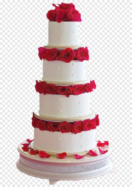 Download this exquisite 5-tier wedding cake PNG image for your special events and digital projects. Featuring elegant white frosting, each tier is beautifully adorned with vibrant red roses and delicate pearl accents, creating a romantic and sophisticated look. The cake rests on a rhinestone-decorated stand with scattered rose petals, perfect for adding a touch of glamour. Ideal for wedding invitations, anniversary designs, party decor, or any graphic requiring a stunning centerpiece. This high-quality, transparent background PNG allows for seamless integration into your creative work. Get your free download now and make your designs unforgettable!
