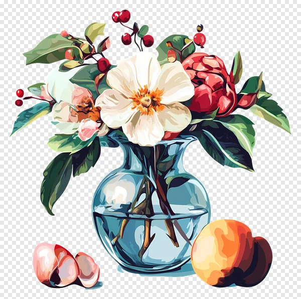 Tags: apricot artistic berries black background botanical bouquet digital art elegant floral flower fruit glass vase green leaves home decor illustration peach peonies red flower still life transparent PNG vase vibrant water white flower