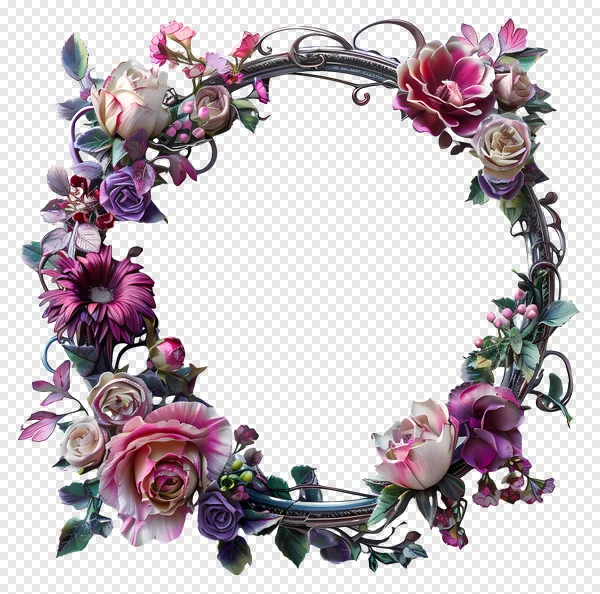 Download this exquisite Floral Wreath PNG for free, featuring a stunning array of pink, purple, and white flowers, including delicate roses and a deep fuchsia gerbera-like bloom. This elegant botanical frame is intricately designed with lush green foliage, subtle berry accents, and ornate silver-toned elements, creating a captivating circular border. Isolated beautifully on a transparent black background, it's perfect for wedding invitations, greeting cards, digital scrapbooking, unique social media graphics, or adding a touch of sophisticated charm to any creative project. Enhance your designs with this high-quality, vibrant flower border today!