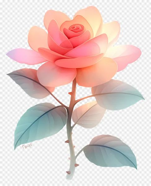 Download this exquisite free PNG image of a stylized gradient rose, perfect for your digital projects. This stunning floral illustration features soft pink and peach petals gracefully unfurling, complemented by cool blue-grey leaves and a delicate thorny stem. Its transparent background makes it ideal for seamless integration into various designs, from wedding invitations and greeting cards to social media graphics, website elements, and romantic presentations. Add a touch of elegance, ethereal beauty, and modern romance to your creations with this high-quality, beautiful flower graphic. Get your free download now and let your designs blossom!