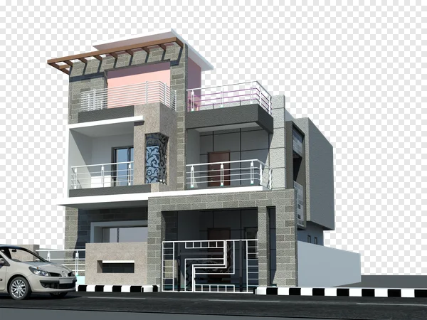 Explore this stunning free PNG of a modern two-story house design, perfect for architectural visualization projects and real estate marketing. This contemporary villa features multi-level balconies with sleek white railings, striking grey textured walls, a chic pink accent, and a stylish brown pergola. The 3D rendering showcases an elegant facade with an ornate metal gate and a white car parked on the driveway, set against a clear blue sky. Ideal for architects, interior designers, homeowners, and anyone seeking high-quality residential building visuals. Download this beautiful, high-resolution architectural home rendering today to elevate your designs and presentations without cost.