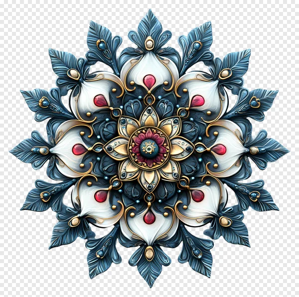 Tags: PNG baroque style blue and white decorative element digital art elegant artwork floral pattern free download gold accents graphic design illustration intricate design jewel medallion luxury decor ornamental ornate mandala red gemstones sapphire beads symmetrical pattern transparent background