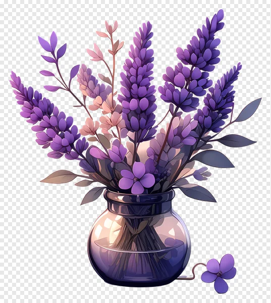 Download this exquisite PNG of a stunning purple flower bouquet elegantly arranged in a clear glass vase. This free digital illustration features vibrant violet and lavender hues, complemented by subtle pinkish tones and dark leaves, all set against a transparent background. Perfect for adding a touch of floral beauty to your designs, websites, presentations, invitations, and digital art projects. Get your high-quality, isolated botanical art asset now and brighten up your creative work instantly with this elegant centerpiece!