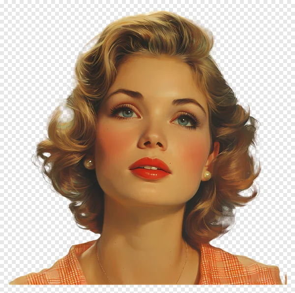 Capture timeless charm with this free PNG download featuring a stunning retro 1950s blonde woman. This captivating portrait showcases a beautiful pin-up style lady with perfectly curled golden hair, striking blue eyes, vibrant red lipstick, and delicate pearl earrings. Her classic plaid top adds to the authentic vintage aesthetic. Ideal for graphic designers, digital artists, content creators, or anyone looking to add a touch of classic glamour to their projects. This high-quality image comes with a transparent background, making it easy to integrate into your designs. Download now and evoke the elegance of a bygone era with this iconic illustration!