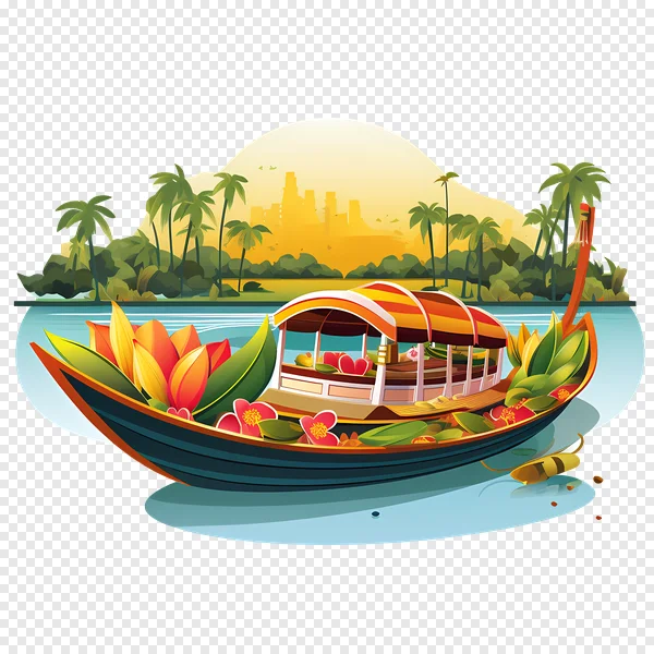 Immerse yourself in a serene tropical escape with this stunning free PNG illustration. Featuring a beautifully decorated traditional boat adorned with vibrant red, orange, and yellow flowers, lush green leaves, and cozy red heart pillows under a striped canopy. The tranquil blue water is framed by majestic palm trees and dense tropical foliage, with a distant golden cityscape glowing against a sunset or sunrise sky. Perfect for travel blogs, vacation planning, digital art, presentations, social media, or any project needing an exotic and peaceful touch. Download this high-quality PNG for free and bring a touch of paradise to your designs!