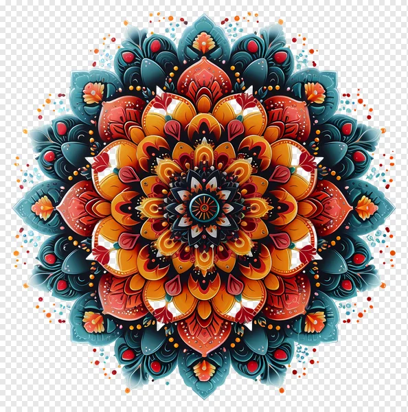 Discover this stunning, high-quality vibrant floral mandala PNG, perfect for your creative projects. Featuring intricate symmetrical patterns in rich shades of orange, yellow, teal, and red on a deep black background, this eye-catching digital artwork exudes a spiritual and decorative charm. Ideal for graphic design, web backgrounds, meditation visuals, or printable art. Download this unique, colorful geometric mandala for free and elevate your designs with its mesmerizing beauty and intricate details. Great for t-shirt designs, posters, or digital wallpaper.