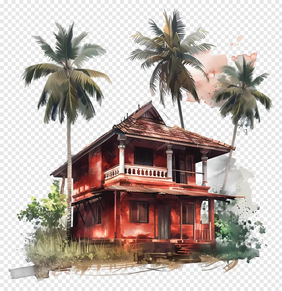Download this beautiful free PNG of a vintage red tropical house, complete with lush palm trees and an elegant balcony. This artistic illustration captures the charm of colonial architecture, featuring a detailed tiled roof, intricate white railings, and classic wooden shutters, all rendered in a rich, earthy palette with a unique watercolor aesthetic. Perfect for adding an exotic touch to your design projects, travel blogs, digital artwork, or presentations. Get your high-quality, transparent background image now for free!