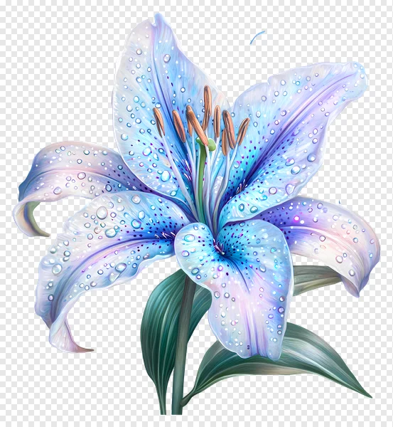 Immerse yourself in the serene beauty of our free PNG download featuring an exquisite light blue and purple lily flower. This vibrant blossom is adorned with countless glistening water droplets, creating a fresh, dewy effect that truly pops. The detailed petals display a delicate blend of pastel blues and lavenders, complementing the striking orange stamens and lush green leaves. Isolated on a transparent background, this high-quality floral PNG is perfect for graphic design projects, presentations, digital art, scrapbooking, or adding an elegant touch to any creative work. Enhance your designs with this breathtaking, nature-inspired image. Download this stunning lily with dewdrops today, absolutely free!