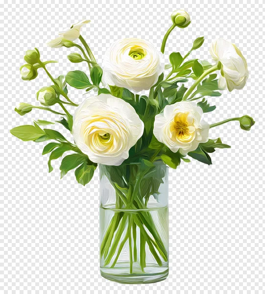 Download this exquisite free PNG of a white ranunculus bouquet, elegantly arranged in a clear glass vase. Featuring lush green leaves, delicate buds, and beautiful white petals with subtle yellow-green centers, this transparent image stands out against its striking black background. Perfect for adding a touch of sophistication to your graphic design projects, presentations, digital art, wedding invitations, or website backgrounds. Enhance your creative works with this stunning, high-quality floral arrangement. Get your free download now!
