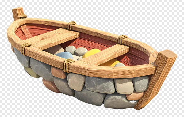 Discover this unique stylized wooden boat PNG, featuring a distinctive hull crafted from colorful, smooth pebbles and rich wood grain details. This rustic rowboat is charmingly filled with an assortment of natural river stones, adding to its aesthetic appeal. Perfect for game developers, graphic designers, or illustrators seeking a high-quality, free transparent asset. Use this charming cartoonish vessel for fantasy settings, nautical themes, or any project needing a touch of natural, handcrafted design. Download this versatile PNG image with a transparent background instantly for your next creative endeavor!