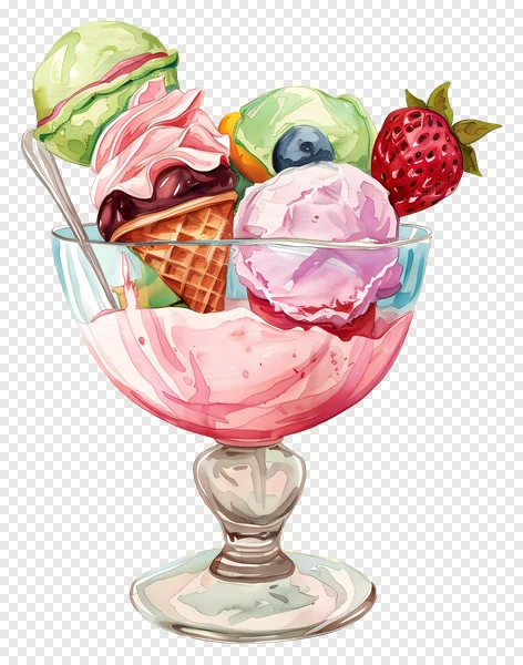 Indulge in this vibrant watercolor ice cream sundae PNG, perfect for adding a splash of sweetness to your designs! Featuring multiple scoops of creamy ice cream (pink & green), a waffle cone with chocolate drizzle, juicy strawberry, and a fresh blueberry, all beautifully rendered in a delightful illustration style. This high-quality transparent PNG is ideal for menus, websites, social media, print projects, and more. Download this delicious dessert graphic for free and sweeten up your creative work without any hassle. Get your free ice cream clipart today!
